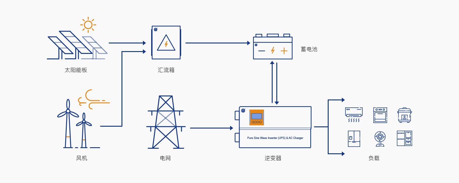 这可以由直流负载使用或通过逆变器转换为交流电源。适用于风大的地区,解决下雨、白天或晚上阳光不足的问题。风能补充电能,实现独立发电系统不间断供电。
